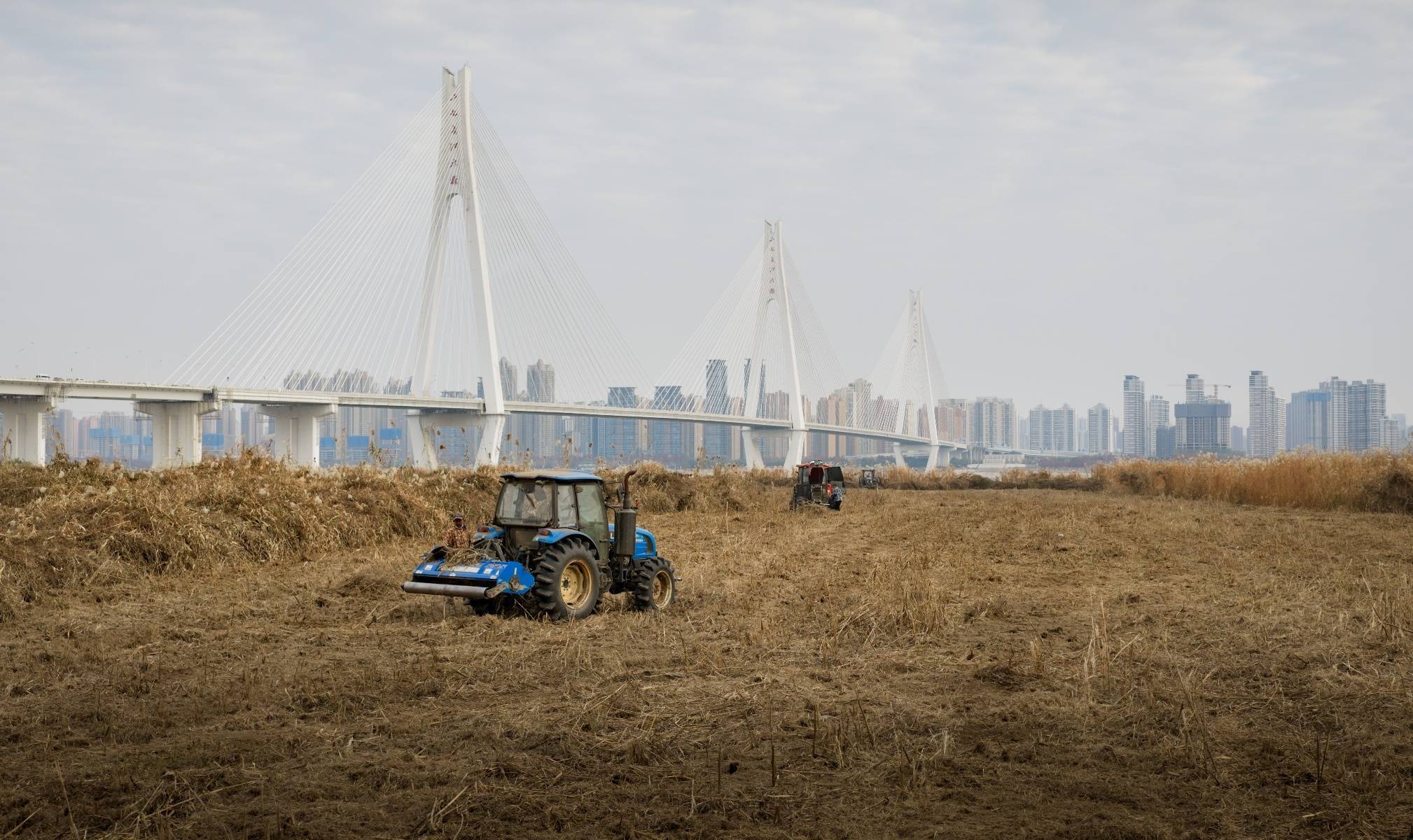 由于冬季防火需要,相关部门正组织旋耕机收割江边的“芦苇荡”。机器将芦苇打碎落入土中,将形成自然肥料,能为芦苇次年的生长提供养分。