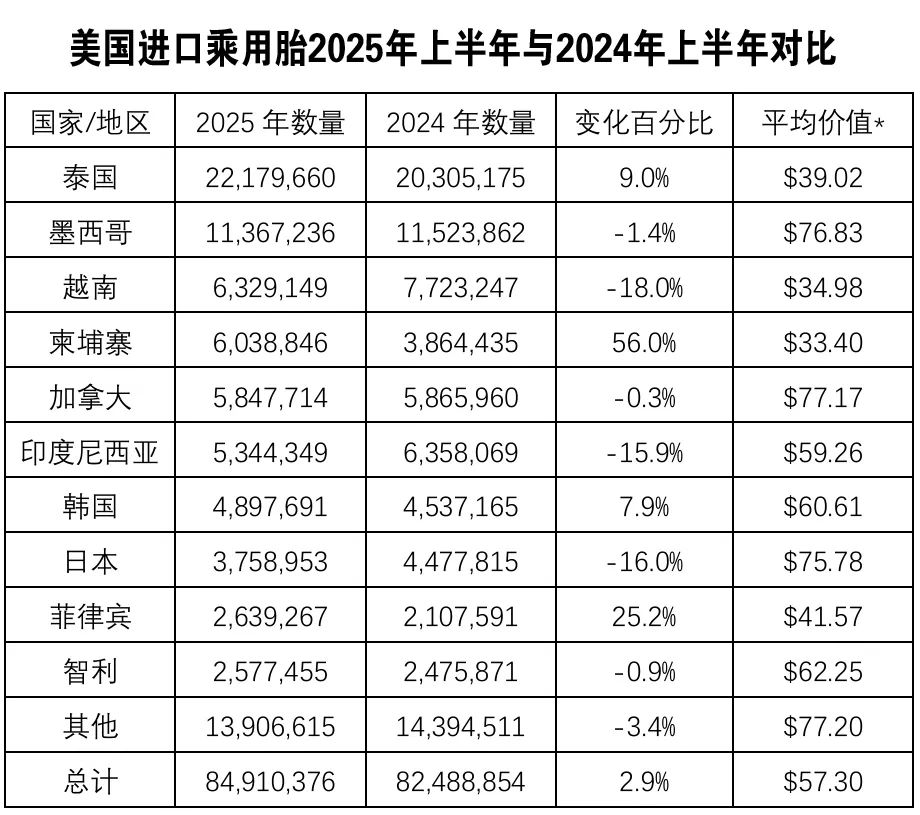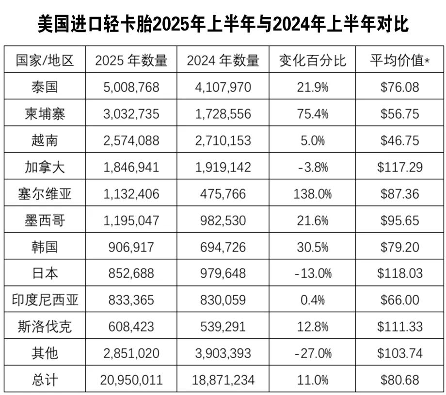 美国商务部最新数据显示,2025年上半年美国轮胎进口量预计将创下历史新高。这一强劲增长不仅反映了美国市场的旺盛需求,更揭示了全球轮胎供应链正在经历一场深刻的结构性变革。在这场变革中,以泰国为首的传统强国地位依旧稳固,而以柬埔寨为代表的新兴力量正以前所未有的速度崛起,成为最大的受益者。