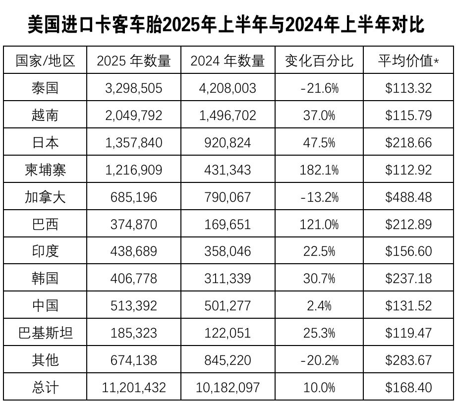 巴西则在中型卡车/客车轮胎领域崭露头角,上半年进口量增长121%,成为另一大亮点。
